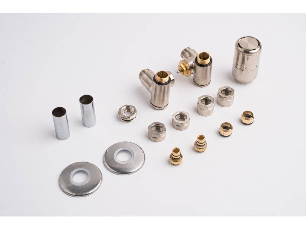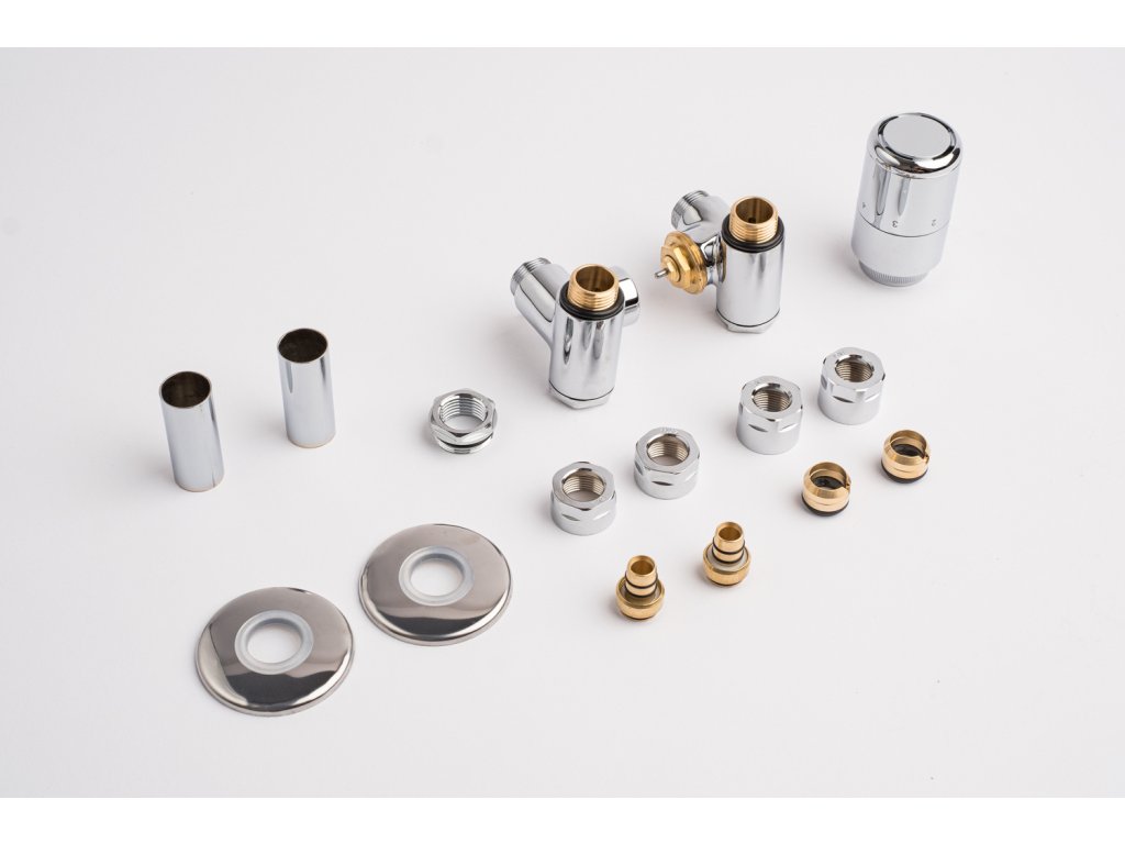 Kompletní sada obsahuje kromě ventilu také krycí rozety a svěrné šroubení pro připojení na měď 15 mm a Alupex 16 mm.