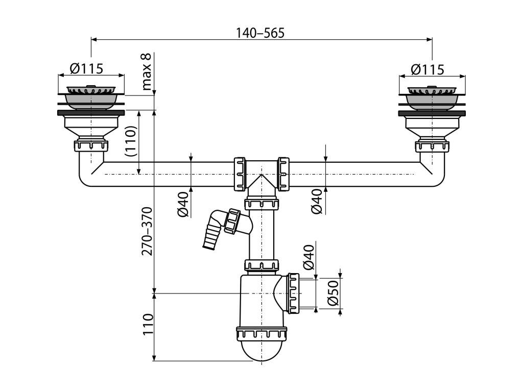 Vývod odpadu připraven pro napojení odpadní trubky Ø50 nebo Ø40 mm
