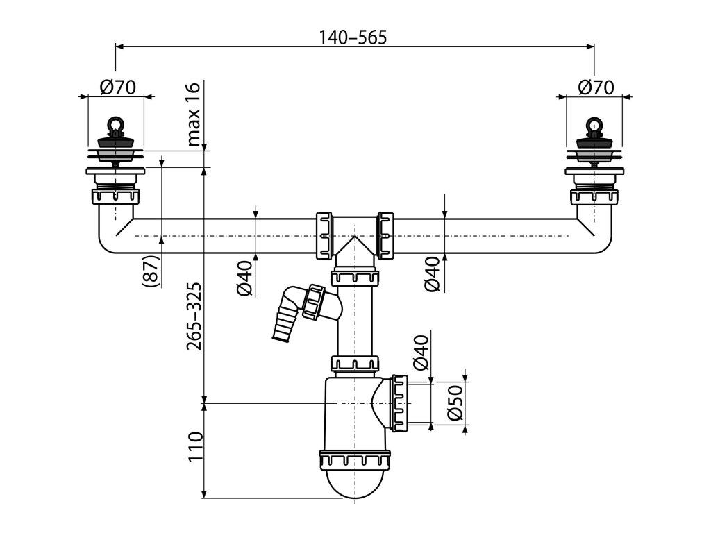 Sifon pro dvoudřez DN 40/50 s přípojkou Ø 17–23 mm, nerezovými mřížkami Ø 70 mm, pryžová zátka A449P-DN50/40