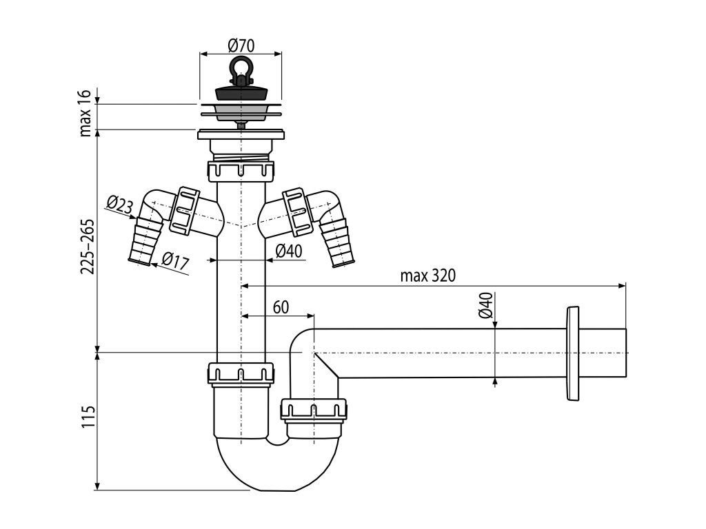 Sifon trubkový dřezový DN 40 s nerezovou mřížkou Ø 70 mm a dvěma přípojkami Ø 17–23 mm, pryžová zátka A820-DN40