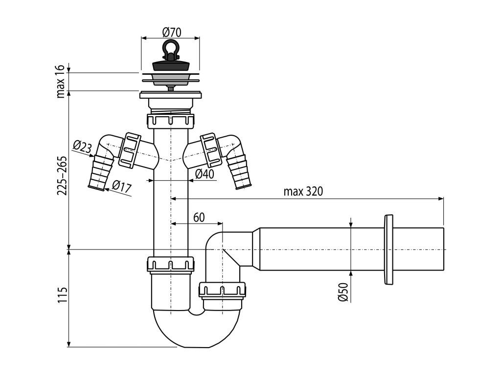 Sifon trubkový dřezový DN 50 s nerezovou mřížkou Ø 70 mm a dvěma přípojkami Ø 17–23 mm, pryžová zátka A820-DN50