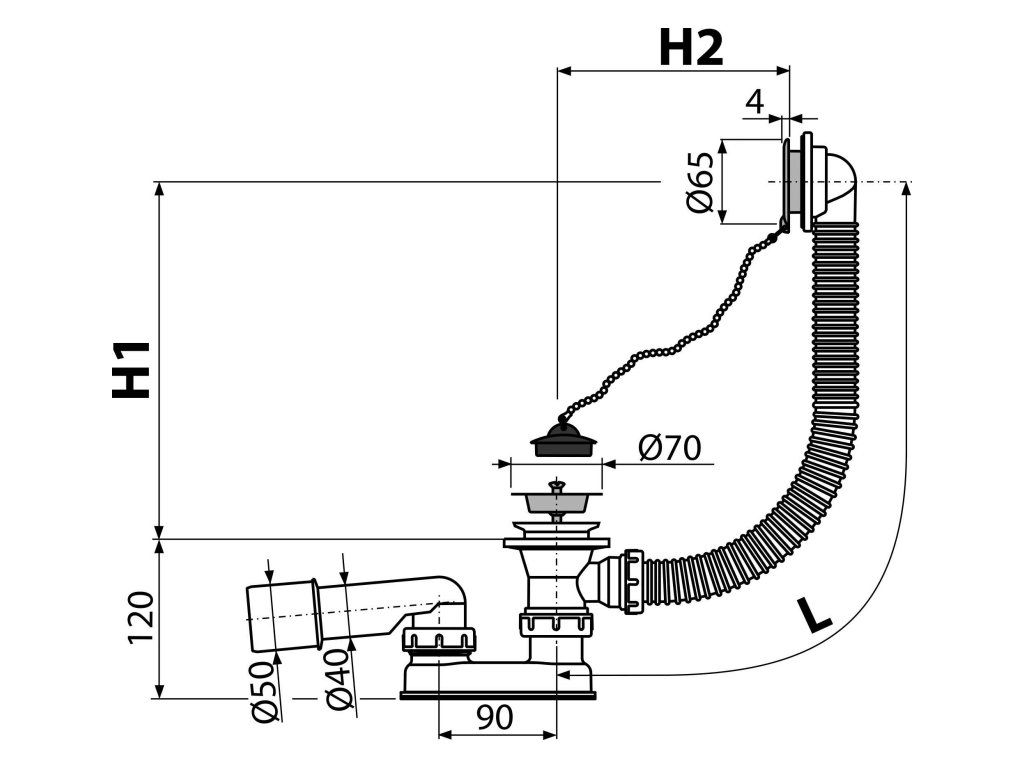 Sifon vanový, délka 57 cm, pryžová zátka, plast, chrom-lesk A501