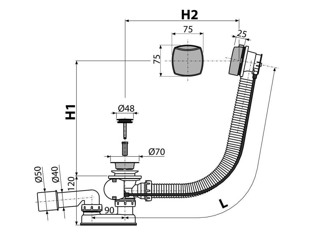 Sifon vanový automat, délka 57 cm, kov/plast, chrom-lesk A51CR