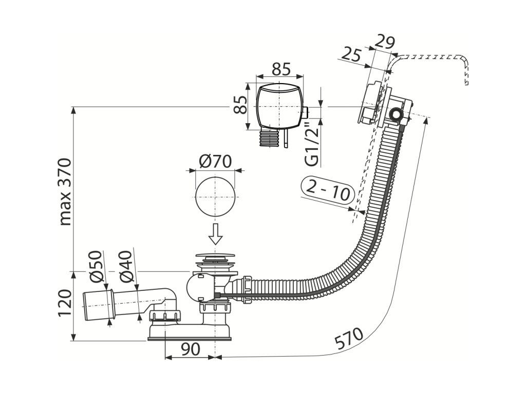 Sifon vanový automat s napouštěním přepadem, délka 57 cm, kov, bílá-lesk A564B