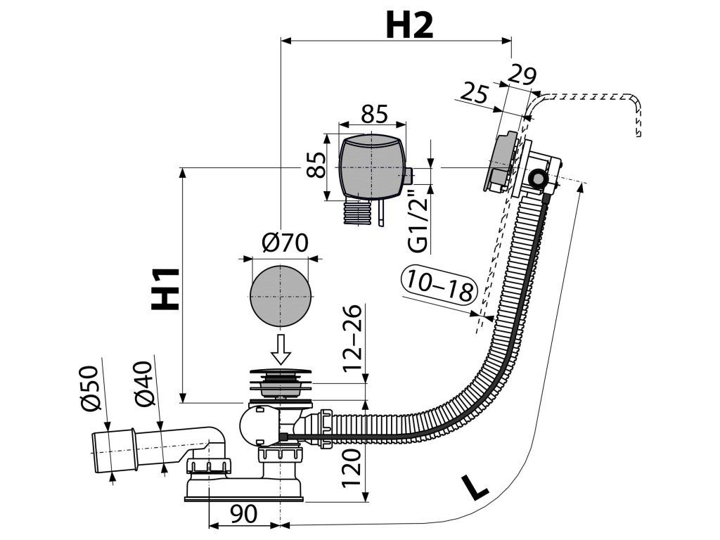 Sifon vanový automat s napouštěním přepadem pro silnostěnné vany, délka 80 cm, plast, chrom-lesk A565CRM1-80