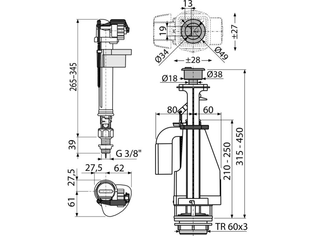 Konstrukce umožňuje seřízení optimální výšky ventilu dle výšky nádržky