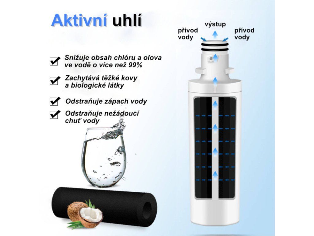 - účinně odstraňuje nečistoty, zápach, těžké kovy, bakterie i chlór