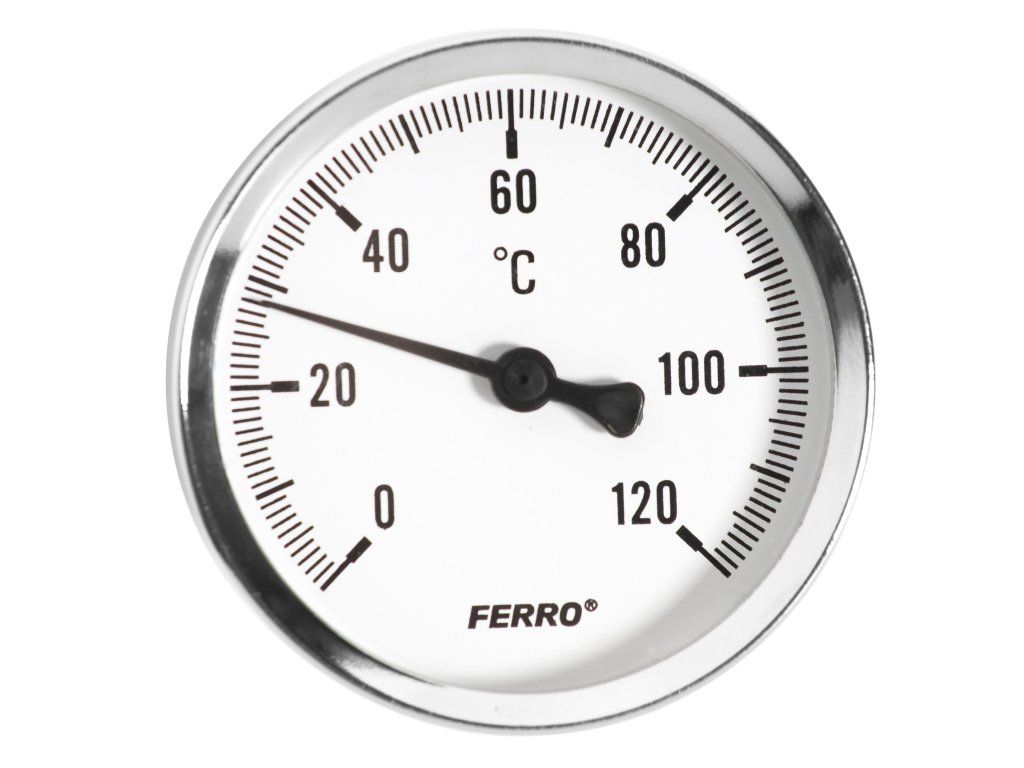 Teploměr axiální<br />• pozinkované ocelové tělo<br />• kryt: odolný materiál poškrábání<br />• kryt hliníkový - práškově lakován<br />• bimetalický teploměr<br />• průměr teploměru: 63 mm <br />• rozsah: 0-120°C<br />• připojení: mosazná jímka 40 mm - 1/2” vzadu<br />Doplňkové parametry
