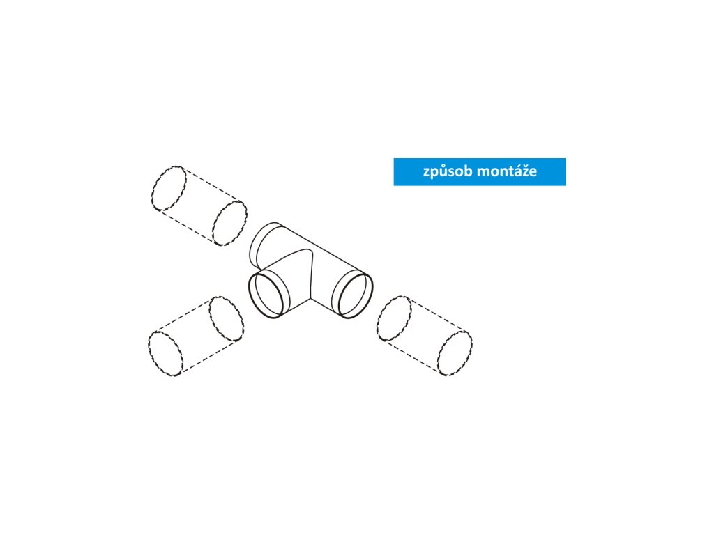 Montáž spojovacího T kusu je velice jednoduchá a bez použití složitého nářadí. Spoje potrubí se do sebe jednoduše nastrčí. T kus je kompatibilní s vzduchotechnickým potrubím 104 mm které má vnitřní průměr 100 mm