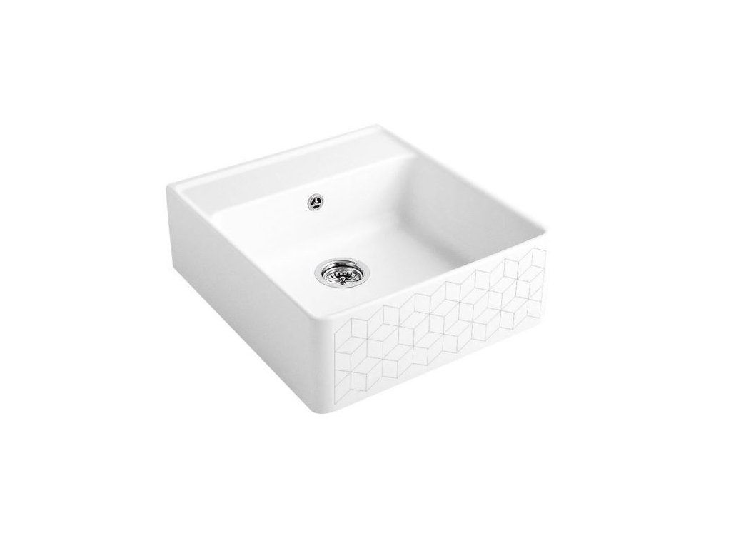 - bílý keramický dřez s geometrickým motivem na přední straně panelu