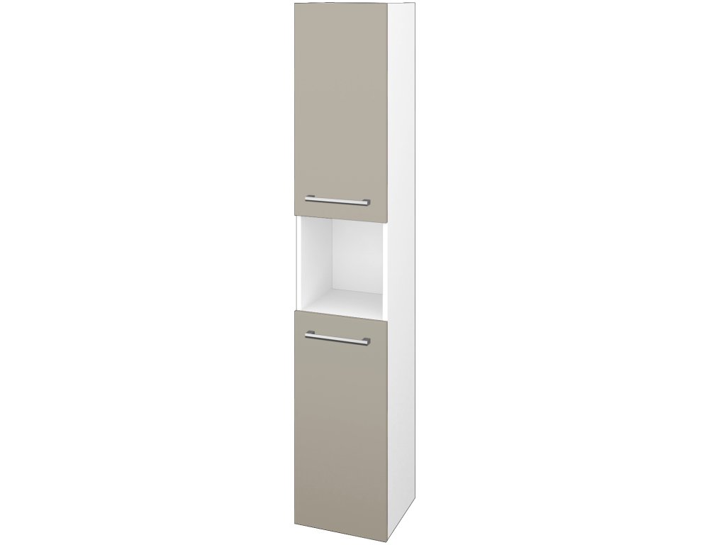 Vysoká skříň DOS SVD2O 35 je konstruována jako závěsná ve dvoudveřovém provedení a prostornou nikou uprostřed. Vnitřní prostory skříně jsou vybaveny čtyřmi skleněnými policemi, které si můžete libovolně polohovat.
