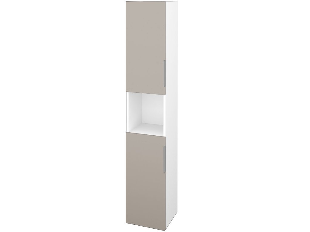 Vysoká skříň DOS SVD2O 35 je konstruována jako závěsná ve dvoudveřovém provedení a prostornou nikou uprostřed. Vnitřní prostory skříně jsou vybaveny čtyřmi skleněnými policemi, které si můžete libovolně polohovat.