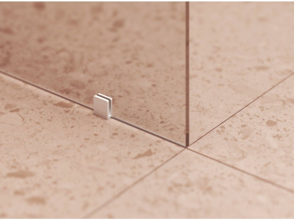 Sprchový kout Walk-In Corner tvoří dvě tvrzená bezpečnostní skla o tloušťce 8 mm, která se spojují rohovým spojovacím profilem. Stabilitu výrobku zajišťuje kovová vzpěra, která spolu s bočním sklem určuje šířku otevřeného vstupu.