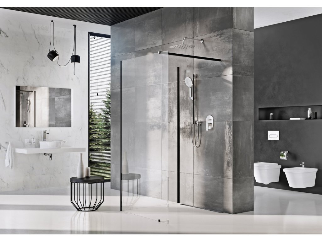 Sprchový kout Walk-In Corner s černou povrchovou úpravou kovových částí. Doporučujeme instalovat přímo na podlahu se zabudovaným odtokovým žlabem nebo podlahovou vpustí. Sprchový kout je univerzální, při montáži si zvolíte pravou či levou orientaci vstupu. Balení obsahuje dvě pevné skleněné stěny s ustavovacím profilem a rohovým spojovacím profilem v černém provedení.