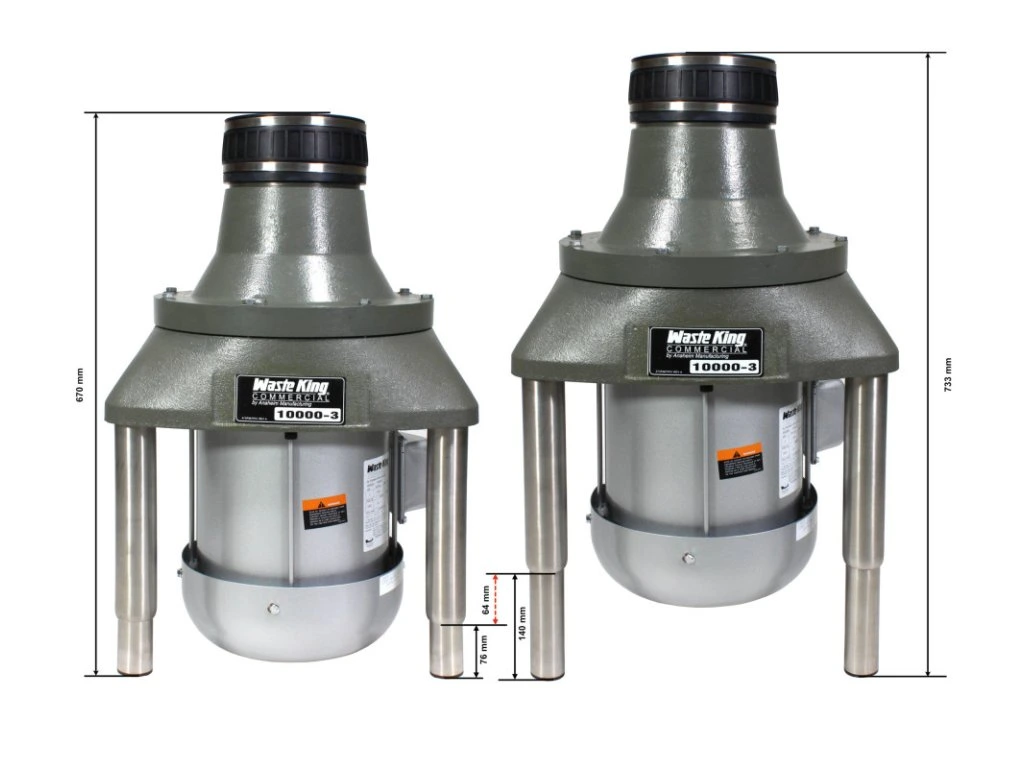 Gastro drtička Waste King 10000 je samostojná, stojí na třech výškově stavitelných nožkách. Napojení na dřez je z materiálu, který tlumí vibrace a hluk vznikající při drcení. Drtič je možné ovládat pomocí pneumatického či kolébkového spínače v závislosti na instalaci.
