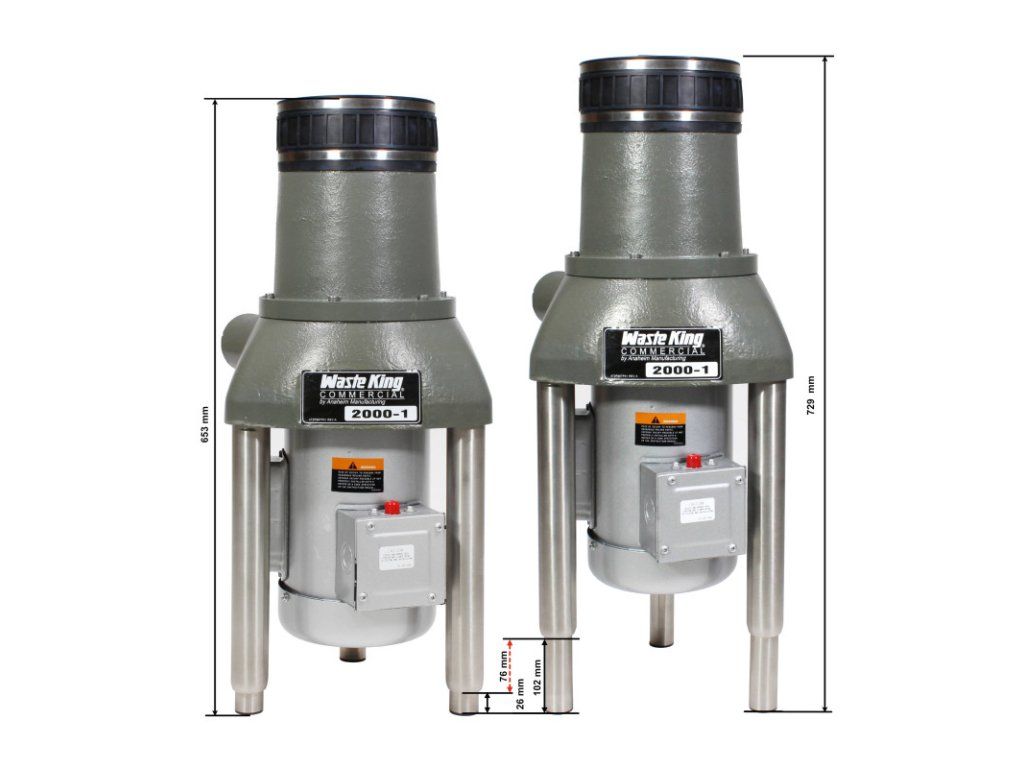 Samostojný drtič kuchyňského odpadu Waste King Commercial 2000 o výkonu 2 HP (1500 W) pro podniky s nepřetržitým provozem připravujících až 3000 jídel ve špičce. Je ideální do větších hotelů, restaurací, nemocnic či supermarketů.