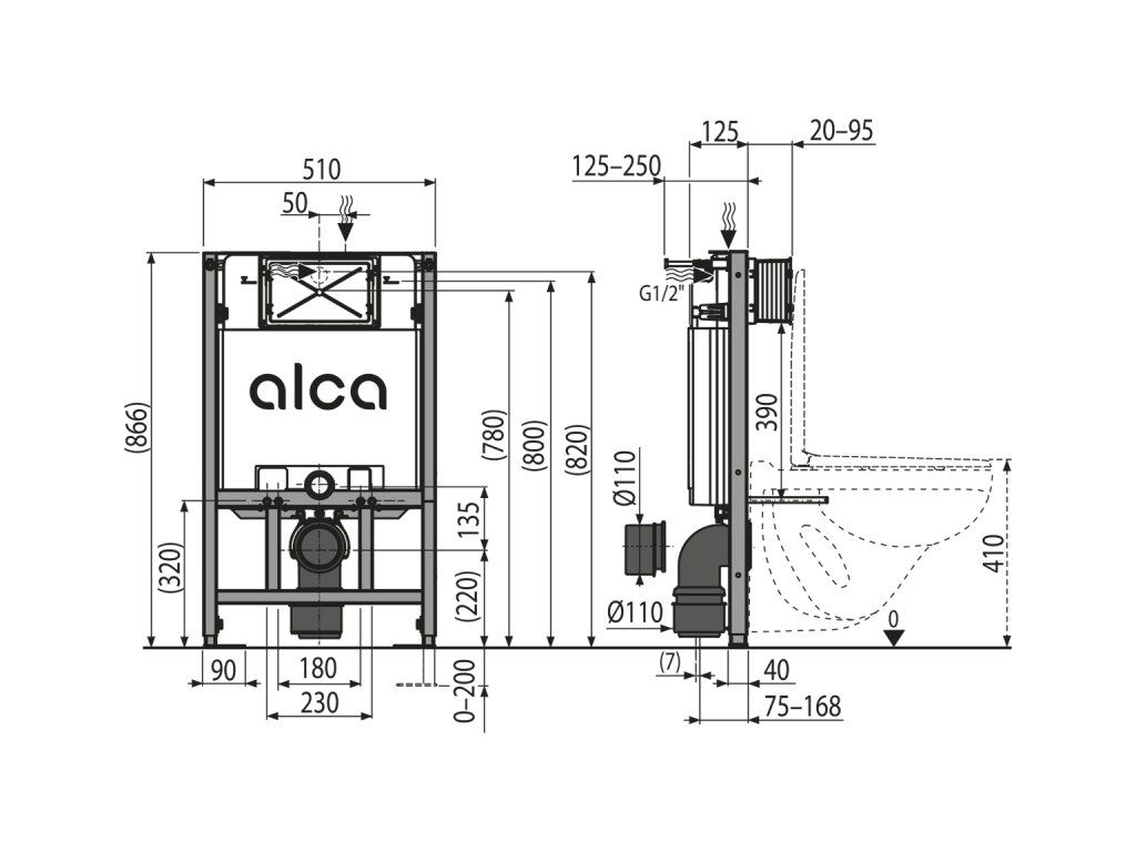 Pro montáž závěsného WC s připojovací roztečí 180 mm nebo 230 mm