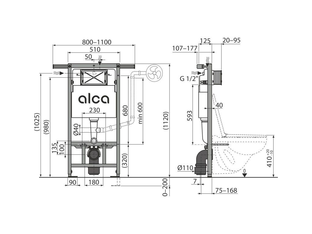 Pro montáž závěsného WC s připojovací roztečí 180 mm nebo 230 mm