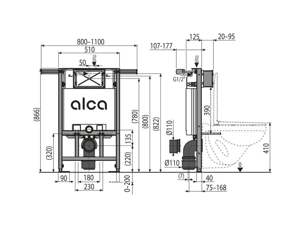 Pro montáž závěsného WC s připojovací roztečí 180 mm nebo 230 mm