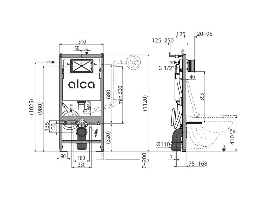 Pro montáž závěsného WC s připojovací roztečí 180 mm nebo 230 mm