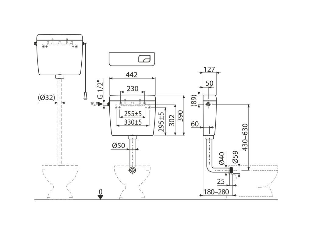 Při instalaci na vysoko položenou nádržku je funkční pouze velké spláchnutí - 6 - 8 - l